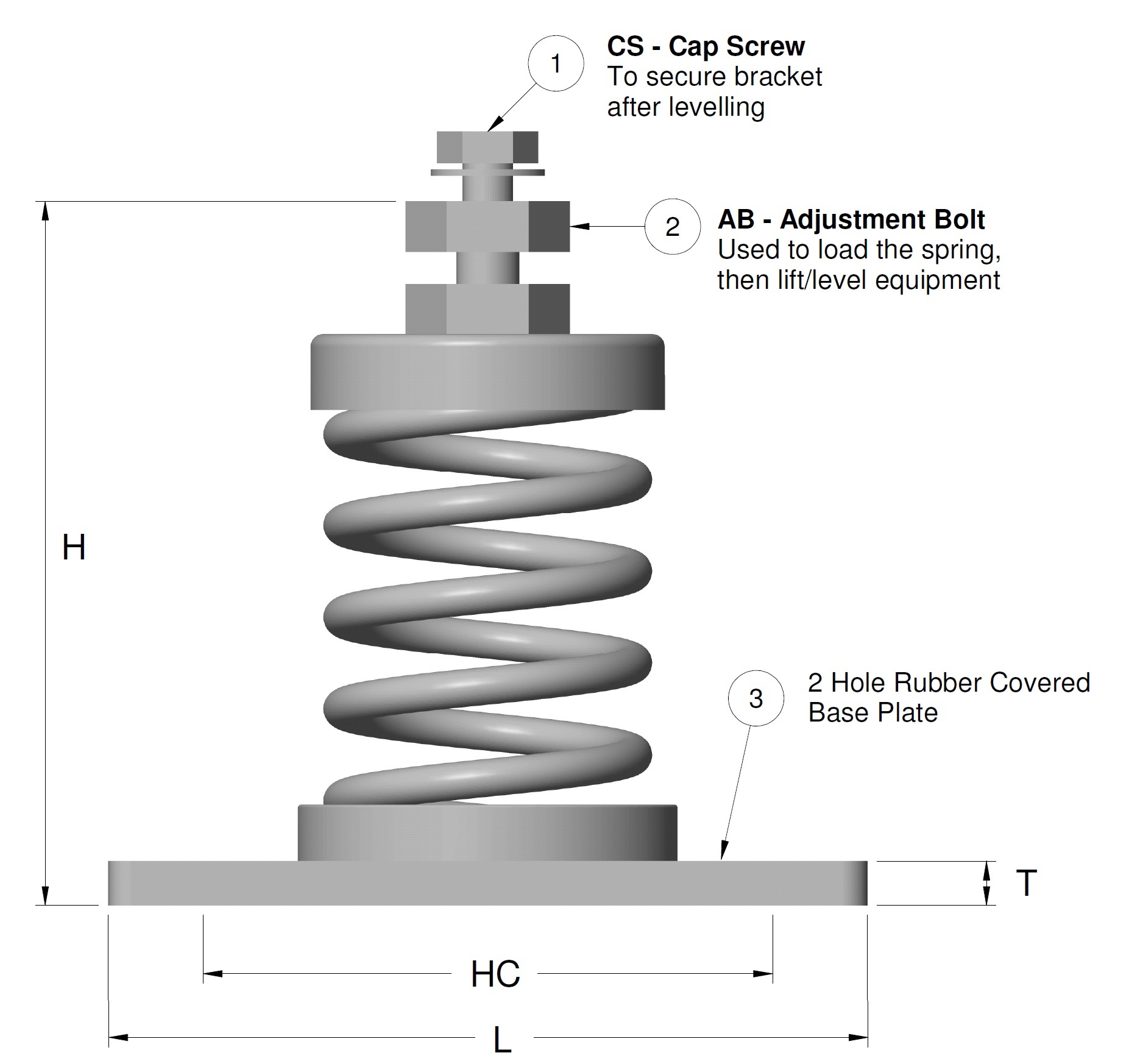 Size Rated Load (kg) Rated Defl. (mm) Spring Rate (kg/mm) Spring Colour Spring Height (H) (mm) AB CS D (mm) HC L (mm) W (mm) T (mm) Bh (mm)